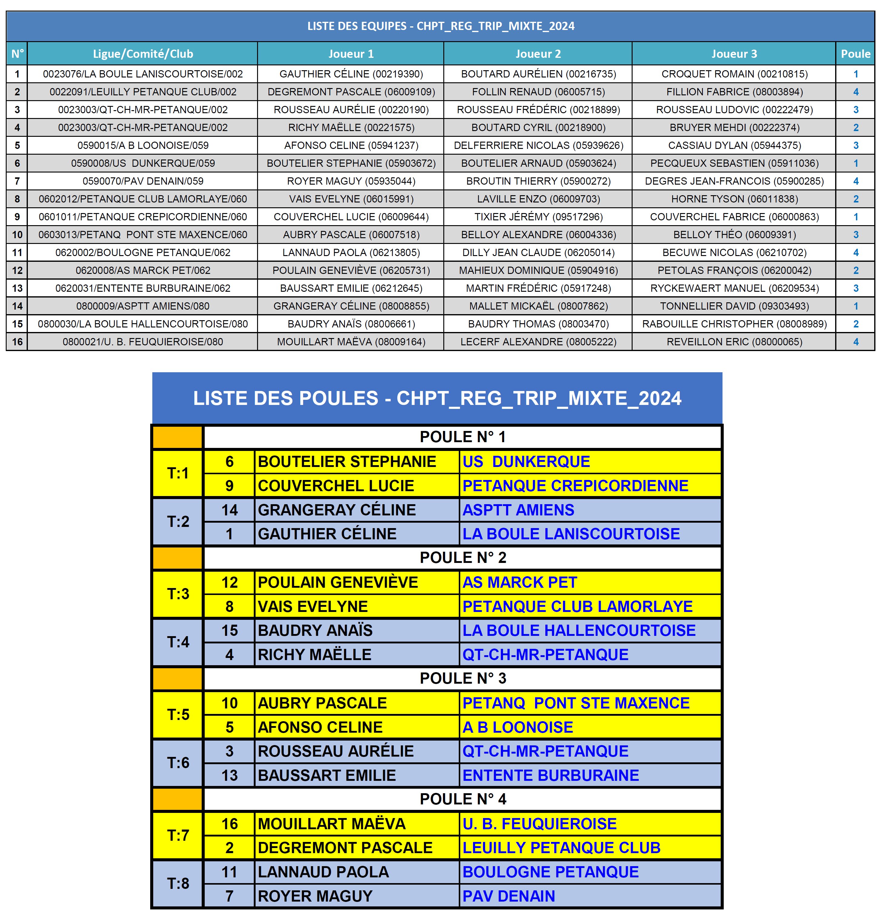 Liste des équipes et Tirage :