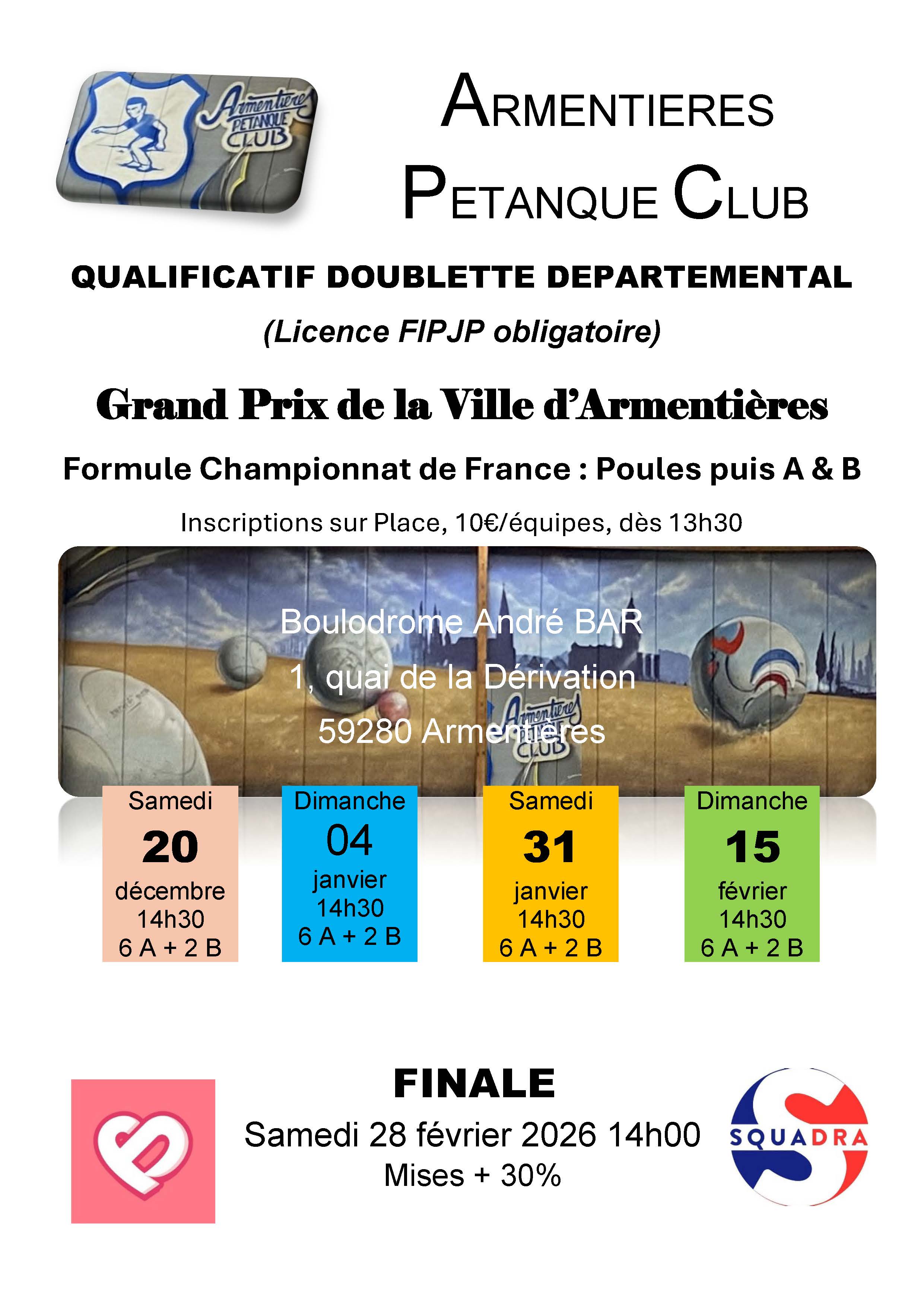 | ARMENTIERES | 15 février | 14h30 | 4 | 4 | X2 Départ. | 6 A + 2 B | 28 février |