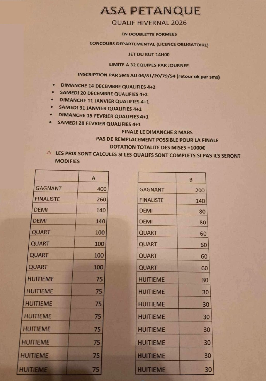 | ASA PETANQUE | 28 février | 14h00 | 6 | 6 | X2 Départ. | 4 A + 1 B | 8 mars |