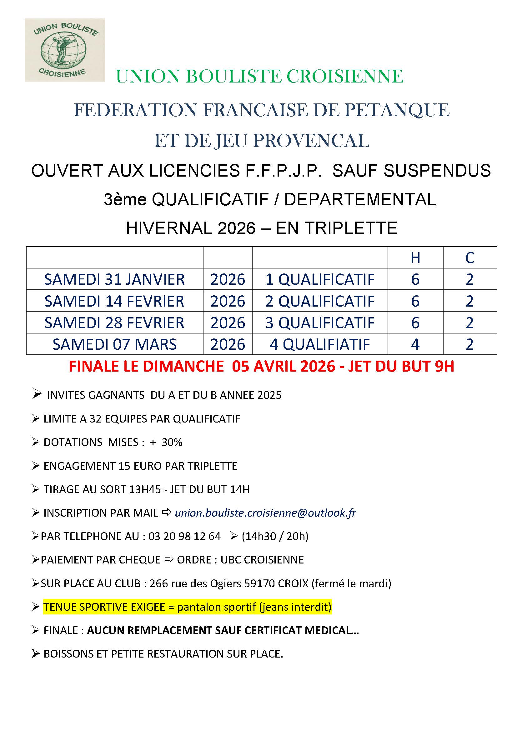 | LE QUESNOY | 24 janvier | 14h30 | FINALE | X2 Départ. | 31 équipes qualifiées | ||
