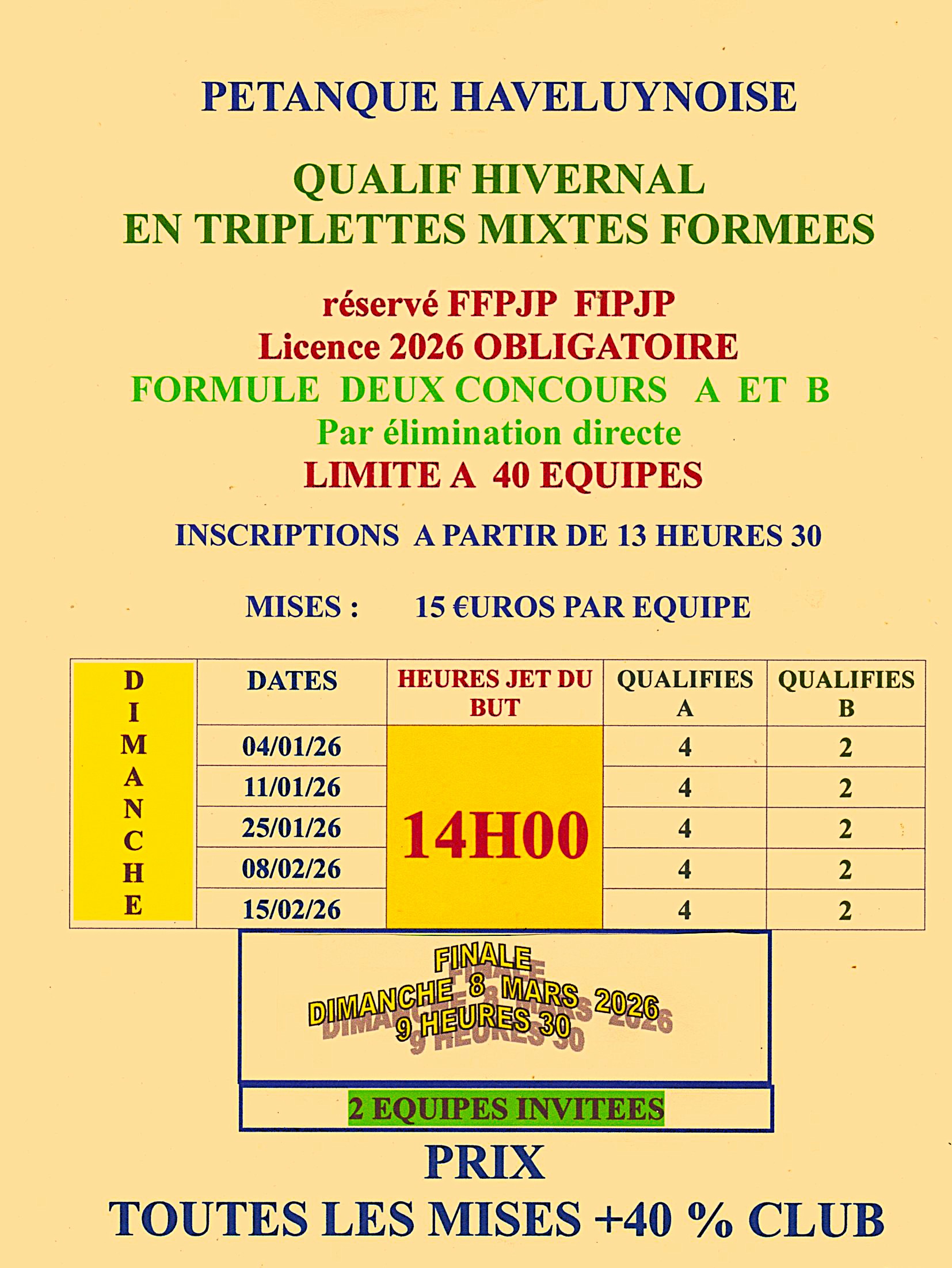 | HAVELUY | 8 février | 14h00 | 4 | 5 | X3 Mixte Départ. | 4 A + 2 B | 8 mars |