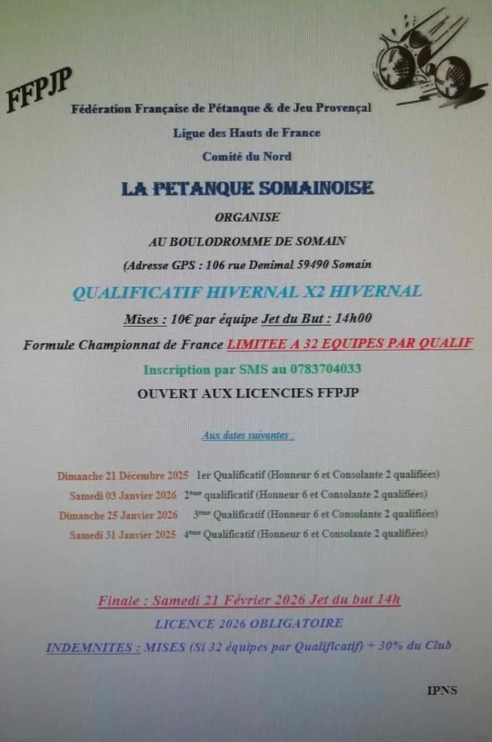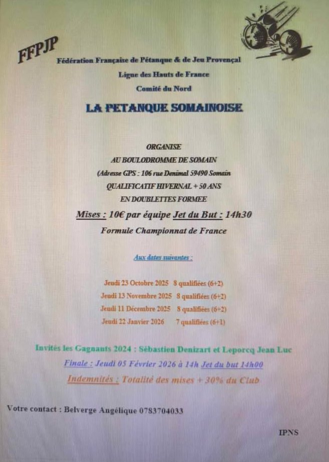 | PET. SOMAINOISE | 22 janvier | 14h30 | 4 | 4 | X2 Propag. 50 ans et + | 6 + 1 | 5 février |
